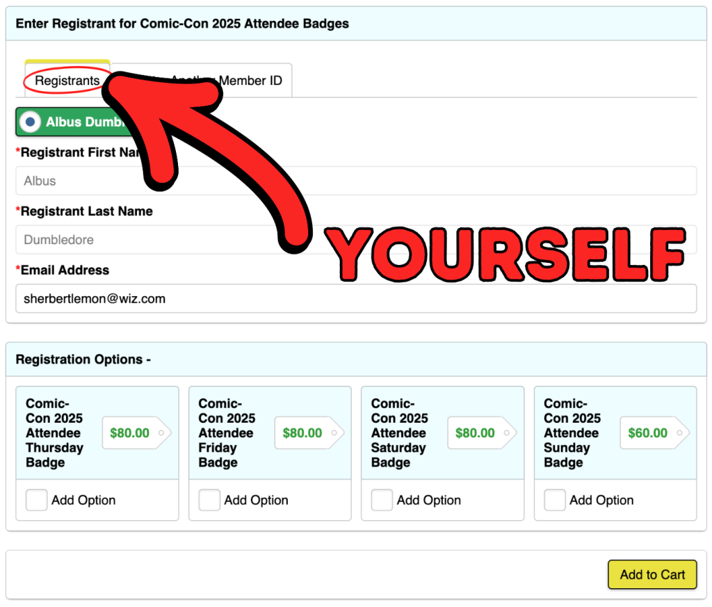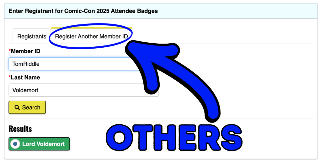 Eligible participants are able to purchase for up to three (3) eligible people. Whether you’re included in that allotment of three, or you purchase solely for three other people (not including yourself), you will be able to purchase badges for friends. But, keep in mind that everyone you are purchasing for MUST also be eligible to participate in Returning Registration. You will need their valid and confirmed Comic-Con Member ID, their last name exactly* as it appears on their Member ID accounts (special characters and accents included), and the days they would like to attend.