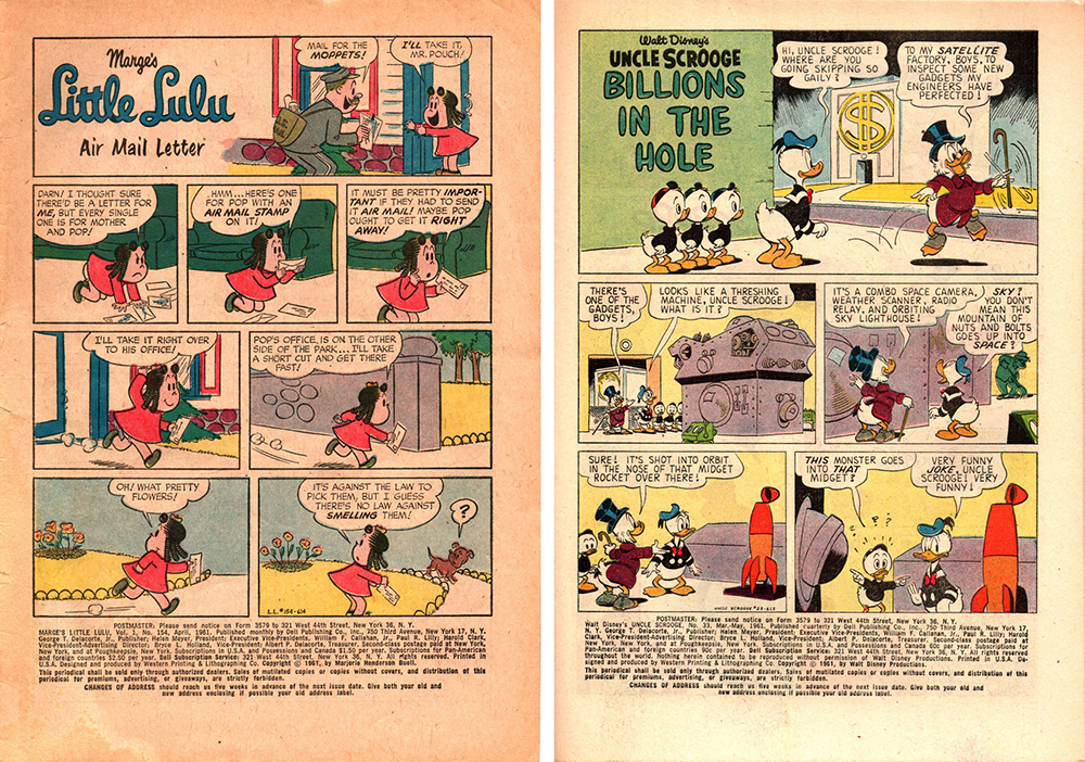 And (though new to the game) we could guess at which companies were approximating their figures. And which titles were doing well. And, yes, analyses could be tricky. For example, Uncle Scrooge #33 [March-May] had an average circulation that topped the field at 853,928 per issue, according to today’s Comichron website. Comichron (from which I grabbed this data) points out that Uncle Scrooge’s circulation was highest—but it was a quarterly. More time on the newsstand meant more time to find and buy a copy.