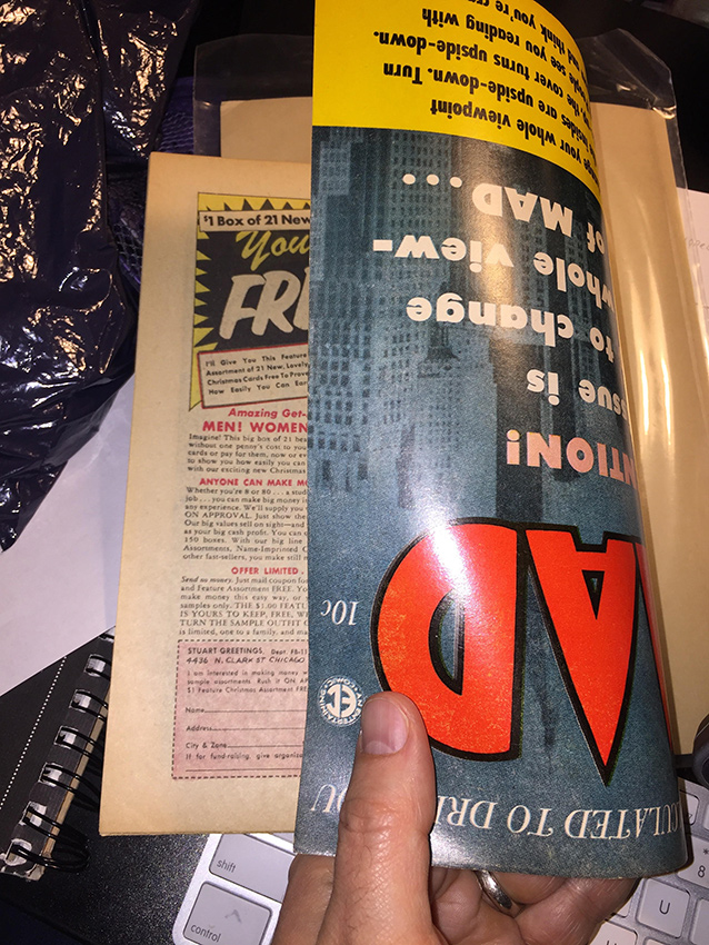 I sat down and, gingerly, gingerly, opened issue #17, the cover of which is only type, superimposed over a blue-tinted photo of skyscrapers. The copy promises that “This issue is going to change your whole viewpoint of MAD …” with a black and yellow banner across the bottom explaining that the insides are upside down. Sure enough, they intentionally attached the covers upside-down and backwards. Open the front cover and you see the last page of the comic upside-down. Even with the cover banner, I can’t imagine how many times they would have had to reassure their printer that this was what they really wanted to do.