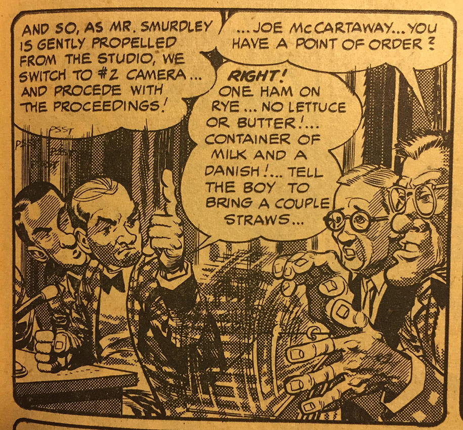 If the comic wasn’t making its point clearly enough in those first eight pages, it then moves on to a parody of the McCarthy hearings, offered up as a game show. “What’s My Shine” is drawn by Jack Davis, in black and white with craft-tint grey tones, and—rare for comics of this era—is printed without any additional color, to look more like an actual 1950s TV show. It swings directly at McCarthy’s red-baiting, and even features a creepy, muttering Roy Cohn figure virtually attached to McCarthy’s right earlobe in every panel. McCarthy’s sick lies and accusations are shown for what they really are, as is the media’s reliance on the spectacle of easy conflict.