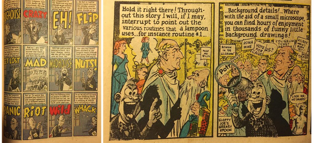 The comic moves on to satirize corporate messaging, the concept of beauty, hedonism, and finally, at the end, it satirizes the very notion of satire. A figure that represents the writer standing in front of a comics rack is at loss because there are now 12 different monthly parody comics, (there really were!) and he works the name and logo of each one into a soliloquy that runs through successive panels on a 12-panel page (above, left). This leads into a magnificent act of sawing off the limb they’re sitting on a comic called Julius Caesar, which looks like it’s going to lampoon the Marlon Brando movie of the time, but instead shines a light on all the tired tropes and strategies that go into making a lampoon. Wally Wood draws the writer standing in front of the panels of the comic, casting a shadow on them as if he was lecturing in front of a movie screen, the chaos mounts, and by the end the reader is presented with new critical tools to scrutinize the very comic he’s holding (above, right).
