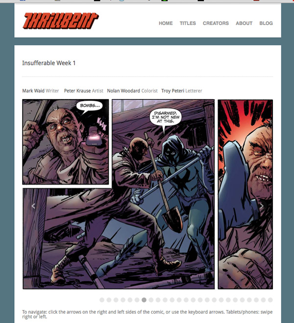 Mark: You know what, I have a very patient family and very patient friends who understand that there are many times that I’m just going to have to hole up in my office for hours and hours and hours at a time. It’s a good problem to have. I can never complain about having too much work. I hope that the work itself doesn’t suffer with the amount of over-committing and stuff, but the thing is—to some degree—it all uses different muscles. I mean Hulk, Daredevil, that’s playing in somebody else’s sandbox, same with Steed and Mrs. Peel really. And those are fun stories to tell, but to some degree I’ve been with those characters since I was a kid, so they’ve always been percolating in the back of my mind. With the Thrillbent stuff obviously, it’s a lot more having to be out of my own imagination. In that sense it’s a lot more work, but at the same time I’m being able to invent new ways of telling stories along with Peter Krause and Nolan Woodard and Troy Petrie, the creative team on the book, and that energizes me.
