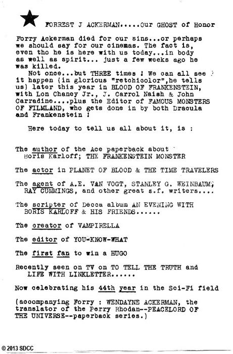 “The Fan’s Fan! FJA.” Forrest J Ackerman was just that for all his life and a beloved guest at Comic-Con over the years. Besides editing the fan-favorite magazine Famous Monsters of Filmland, Forry was an agent for science fiction authors (such as Ray Bradbury), was a member of science fiction’s First Fandom, and had one of the largest and most impressive collections of movie and science fiction memorabilia in the world.