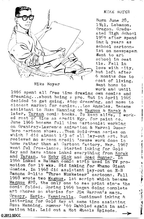 Mike Royer was another minicon special guest, and he provided a self-portrait and wrote his own biography. This is probably right before Mike became the primary inker and letterer on Jack Kirby’s Fourth World books for DC Comics (Forever People, New Gods, and Mister Miracle), as his bio mentions his work as Russ Manning’s assistant on the Tarzan books for Gold Key.