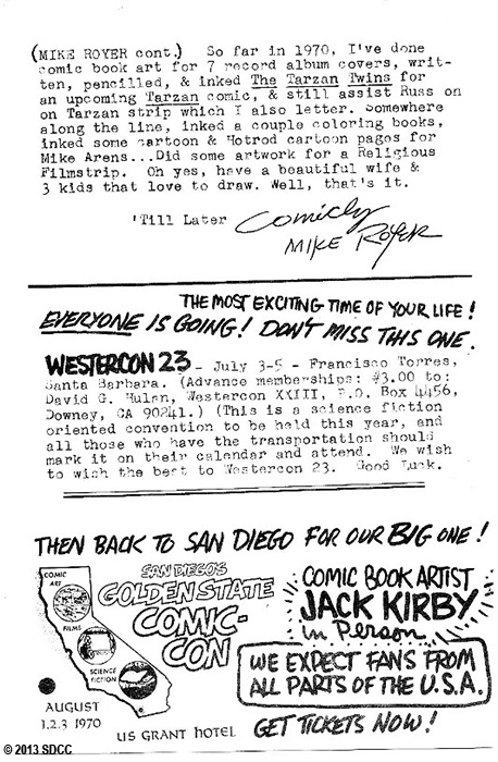 Here’s the ad for the first official San Diego Comic-Con in August, along with one for the science fiction convention Westercon XXIII, held in Santa Barbara, CA, in July of that year, plus the remainder of Mike Royer’s bio. “Comic book artist Jack Kirby in person!”