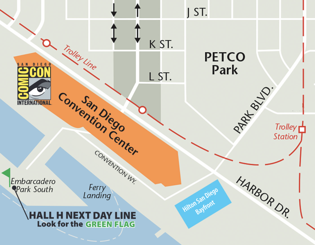 First-Seating wristbands will be distributed at the front of the Next Day Line for Hall H. Distribution times vary each day. Please see the map above for the location of the Next Day Line (near the green flag).
