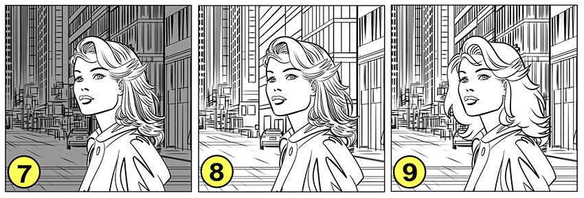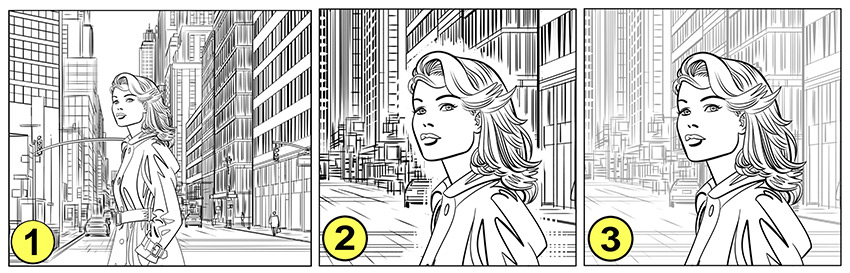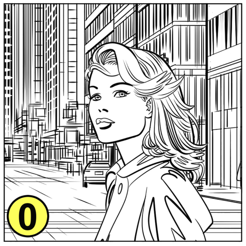 Consider image “0” at right. The lines in the woman’s hair blend confusingly with the windows of the building beyond her, and the busy details of the street scene compete with her face for our attention. Shrunk to the size of an average panel, a figure could get lost in those details, especial if she were turned away from the reader, or if there were more lines on her face. Let’s examine nine ways to avoid that sort of confusion.