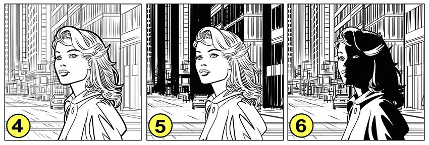 An alternative to heavy shading on the background is heavy shading on the figure. Large black areas on the figure can make her stand out from a detailed background. Depending on the scene’s lighting, you could even silhouette her entirely, for a starker composition.