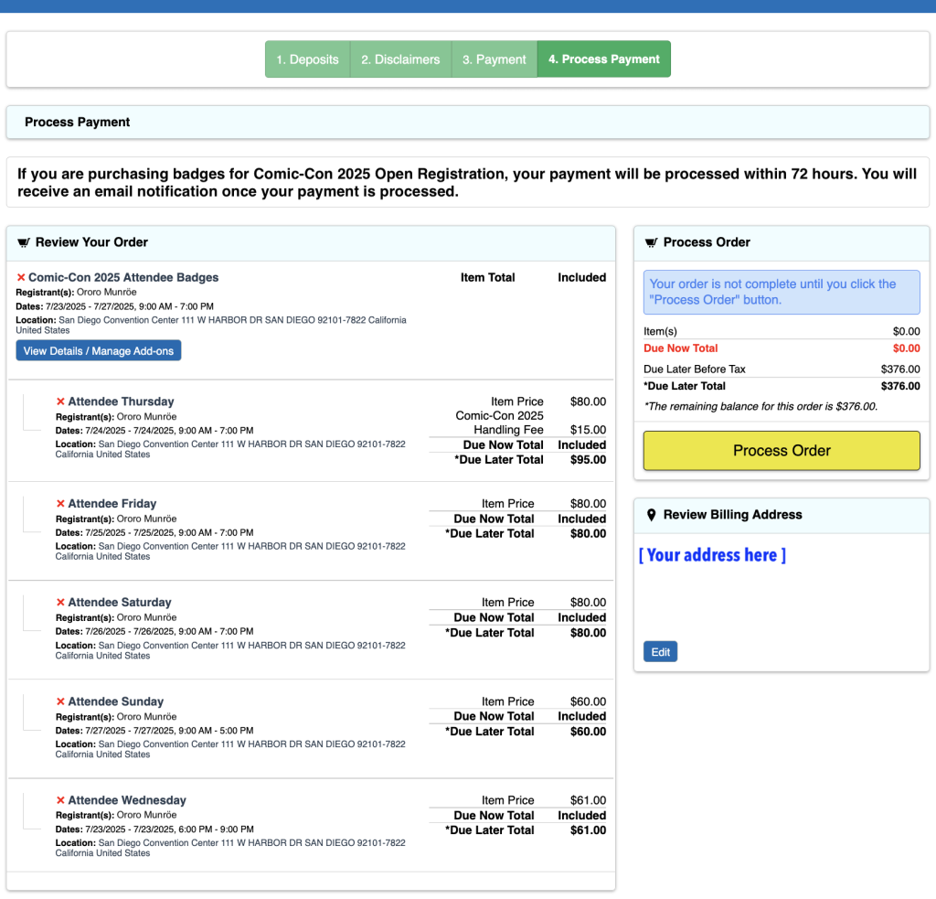 The time has come! If you have a few minutes to spare, review the badges in your cart. Each registrant will have the item “Comic-Con 2025 Attendee Badges” with their individual day selections nested beneath it. If everything looks good, click “Process Order.” An order acknowledgement will be emailed to each registrant.