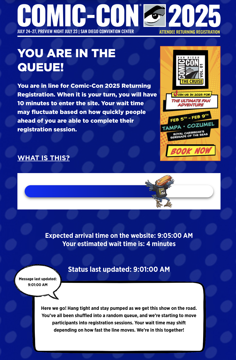 Once the badge sale begins, those in the waiting room will be placed into the queue. You will be able to see your expected wait time and see your walking Toucan begin their journey! Your wait time may fluctuate based on how quickly people ahead of you are able to complete their registration session. The waiting room will have a white status message box that is updated regularly with helpful tips!